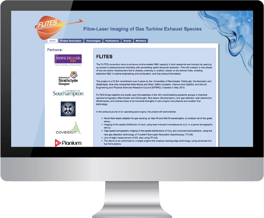 FLITES is a consortium project, sponsored by the UK Engineering and Physical Sciences Research Council (EPSRC), aiming to use thier world-leading advances in laser technology to measure and image molecular and particulate species in gas turbine aero-engine exhausts to advance Research and Development in aviation and other related industries. The consortium members are the Universities of Manchester, Edinburgh, Southampton and Strathclyde, blue-chip companies Rolls-Royce and Shell, SMEs Covesion, Fianium and OptoSci.