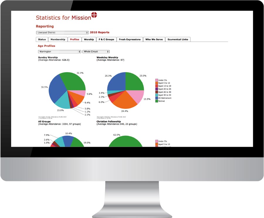 After an initial local trial, in the Manchester and Stockport district, the following year the project was expanded and data was collected from 1,237 churches in the 122 Circuits of the 8 participating Districts. A secure server was used for each church to input their data into a user-friendly form that guided the users through the process with self-checking and intuitive prompts that made input simple, even for those unfamiliar with completing web forms. A subset of the data collected was injected in to the data collected by the Methodist Church Methodist Church in England and Wales so there was no need to input data into two websites.